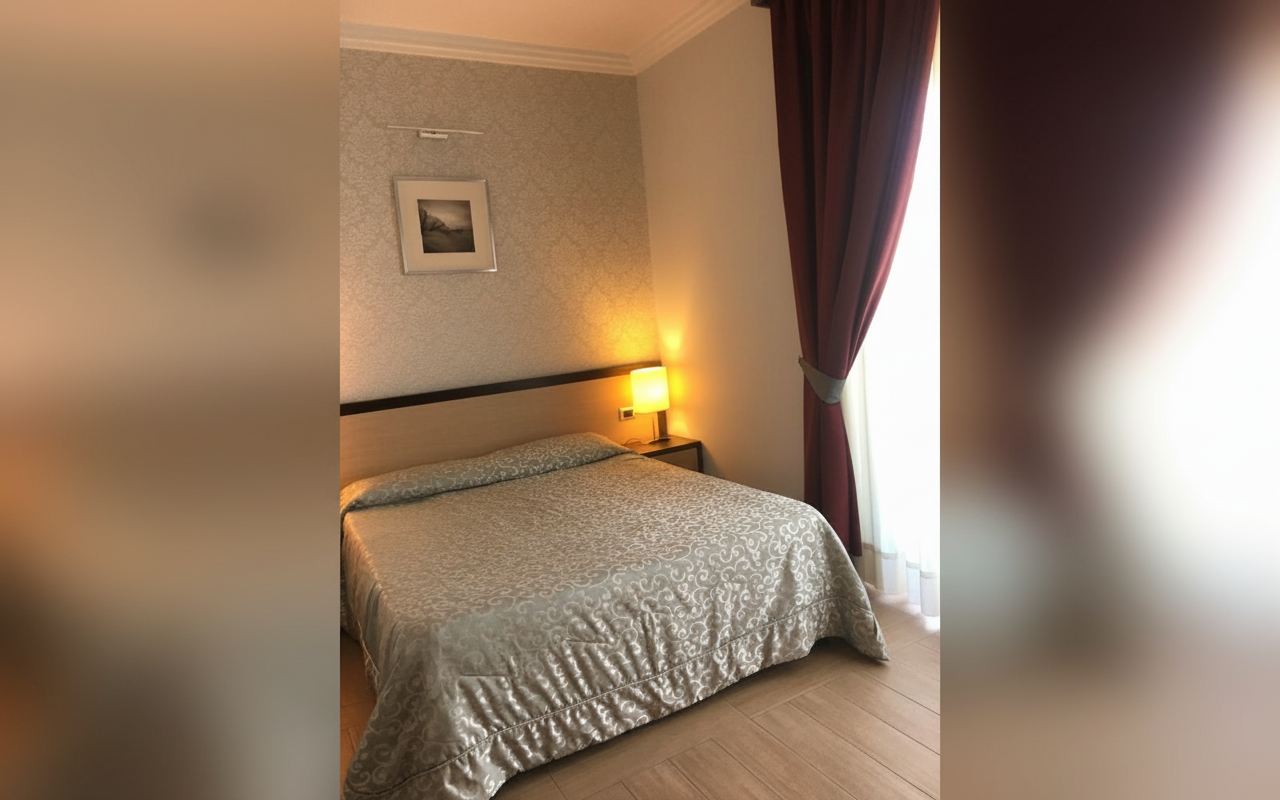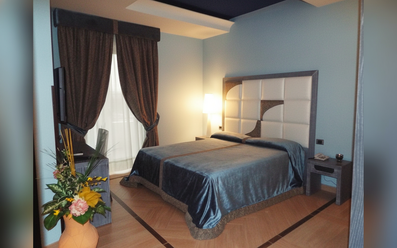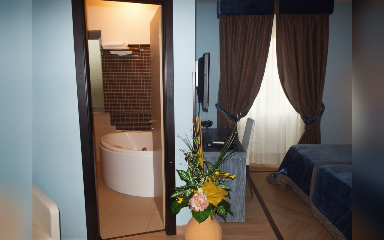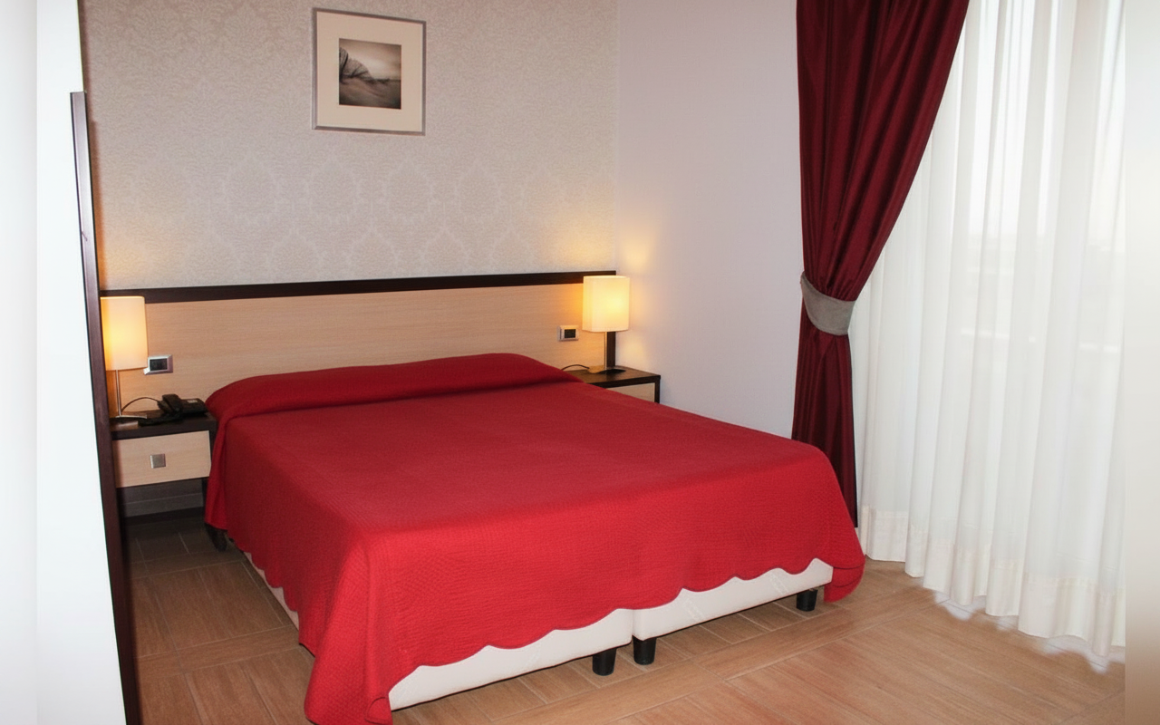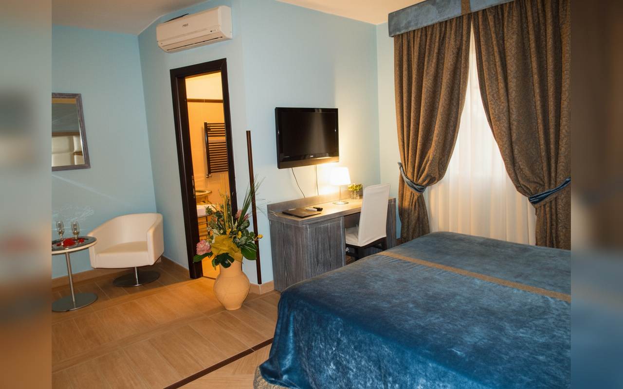 Camera business configurabile con letto matrimoniale o due letti singoli, dotata di aria condizionata, Wi-Fi gratuito, minibar, scrivania e bagno privato con bidet. Ideale per soggiorni di lavoro o brevi vacanze.