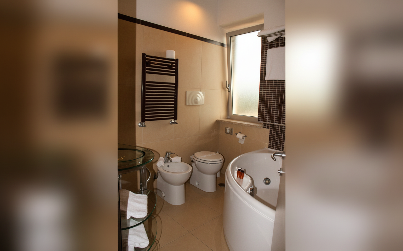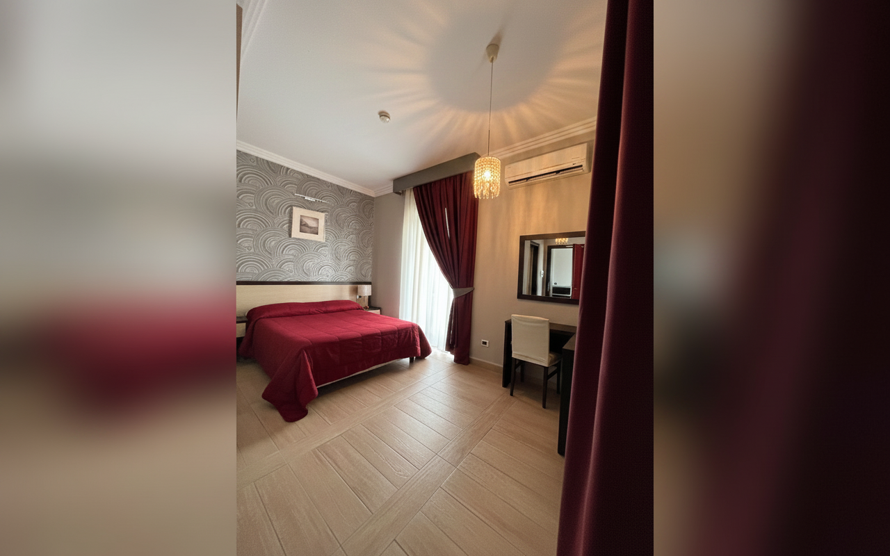 Camera configurabile con letto matrimoniale o due letti singoli, dotata di aria condizionata, Wi-Fi gratuito, minibar e bagno privato con bidet. Il balcone privato offre una vista sulla zona circostante, ideale per momenti di relax.