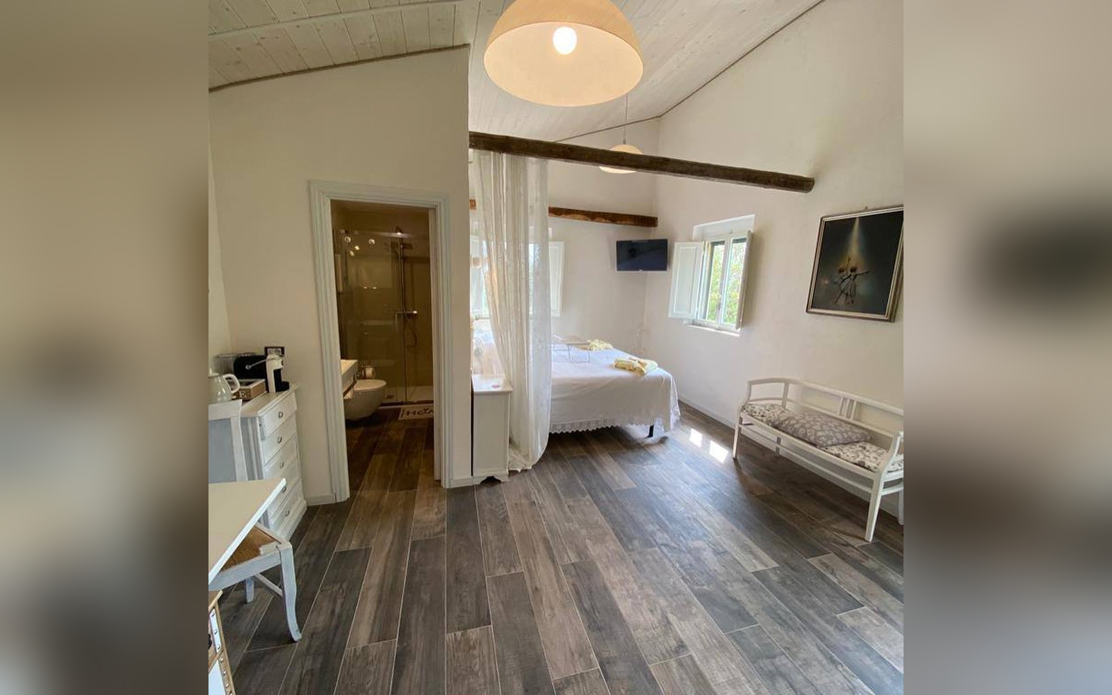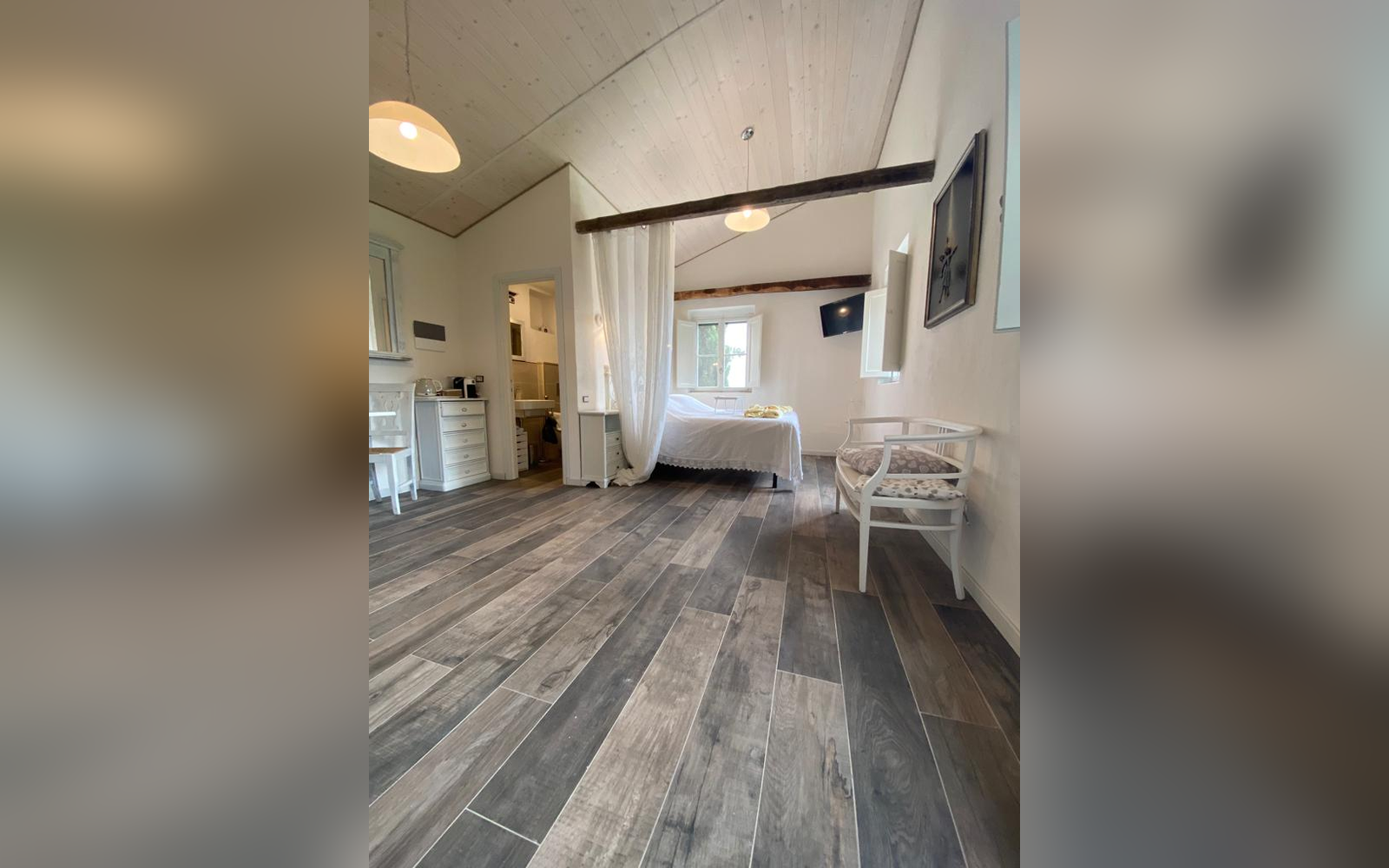 Situata all’ultimo piano dello storico essiccatoio, questa splendida suite open space offre letto matrimoniale, soggiorno con divano letto, bagno e angolo cottura attrezzato. Attraverso una scala in legno si accede alla terrazza solarium privata con balcone panoramico affacciato sulla piscina e sul Lago di Montedoglio. Una soluzione romantica e suggestiva per 2/3 persone.